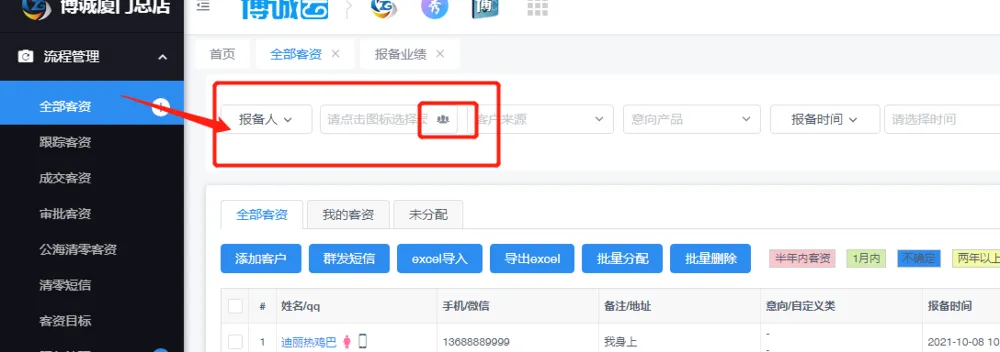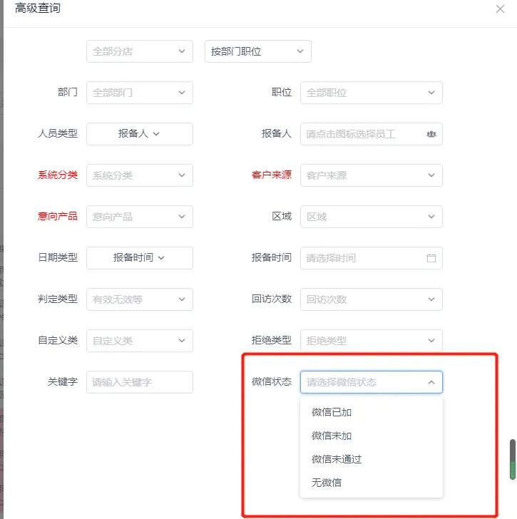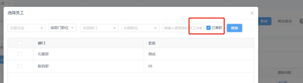 2.客资列表查询:选择报备人窗口,新增离职查询