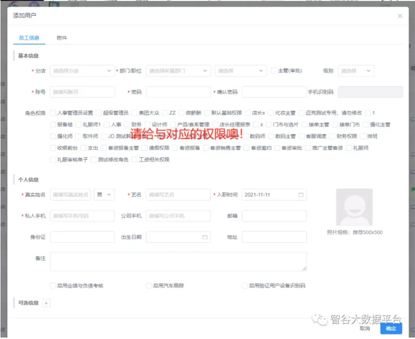 影楼中员工的流动那么就要给新员工准备一个新的账号了!那么我们就 可以在人力系统中新增员工账号,并咋新增过程中给与角色的权限噢!