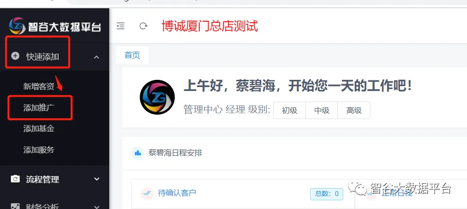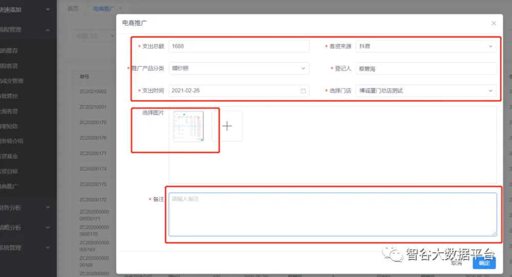 在平台版智谷客资系统里面,软件可以把每日的渠道推广投入填入系统中,这样可以更为方便的帮大家统计渠道投入的资金与产出的比例到底呈现的是怎么样的情况,给管理者在做渠道上的分析带来更为便捷的统计!