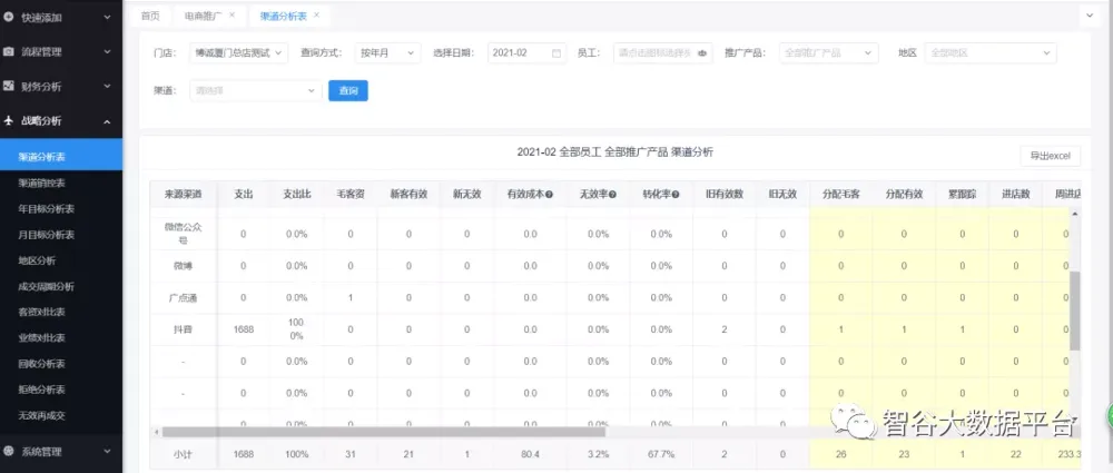 渠道分析表:统计每个渠道的支出与产出定单的情况