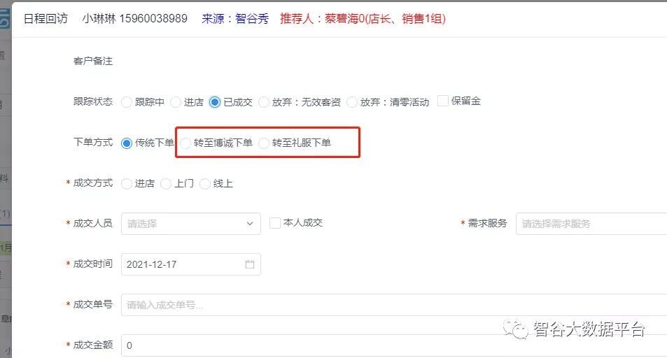 2.日程回访选择已成交新增‘转至博诚下单’、‘转至礼服下单’操作