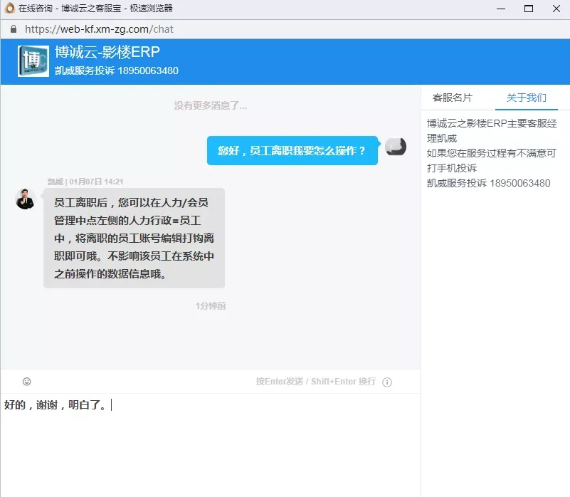 根据企业用户使用习惯以及便捷性,目前博诚云系统在软件中增加了在线咨询功能。除了传统的客服电话、客服服务QQ、客服微信服务外,目前新增了云在线咨询服务。