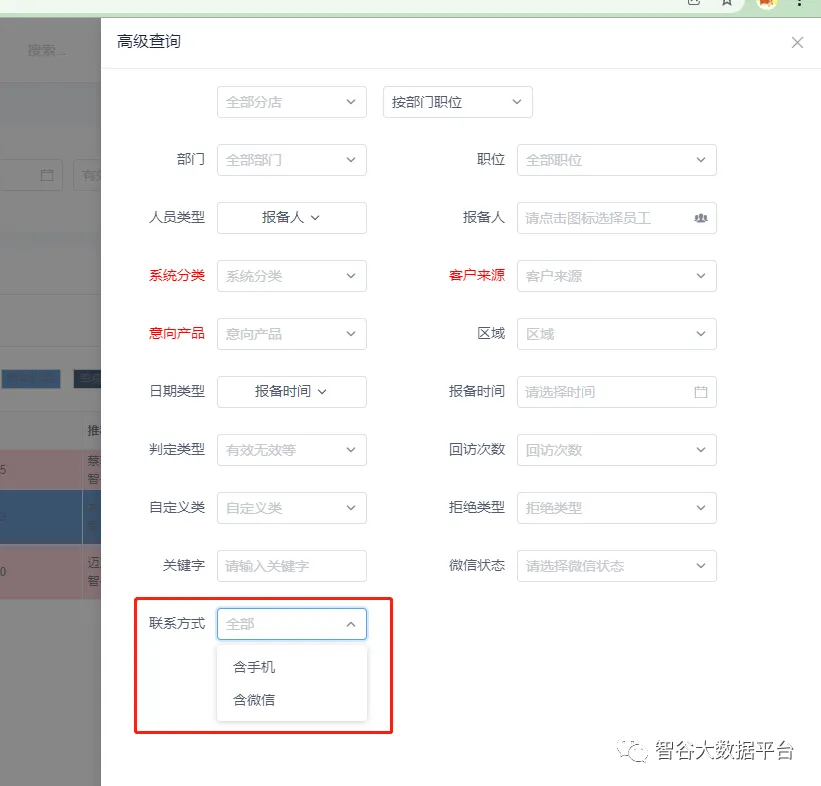 3.客资列表高级查询新增‘联系方式’查询,可选择‘有手机’或‘有微信’联系方式查询客资