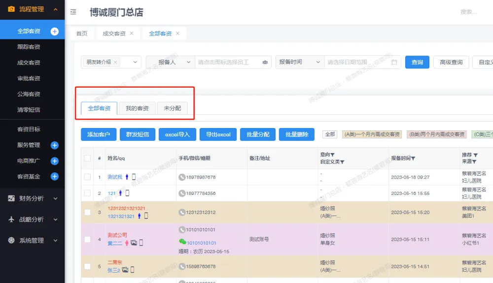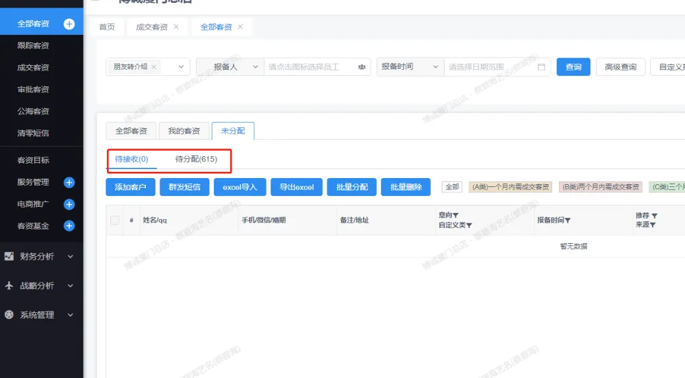 报备输入后的客资在全部客资表格中,分为 全部客资 我的客资 未分配