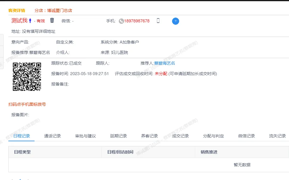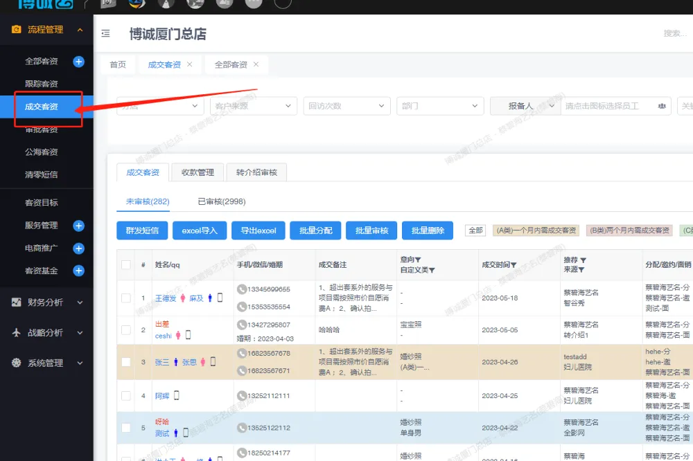 成交客资表中体现是所有成交的客户资料,点开客户就可以查询客户资料与成交情况。智谷客资系统中的客资可以与博诚云中ERP系统与爱尚礼服管理系统打通。如果正在跟踪的客资处于在有效转态下,那么在ERP系统中下单或在礼服系统中订单那么该客资成交数据会随之同步到智谷客资系统中自动设为成交状态!