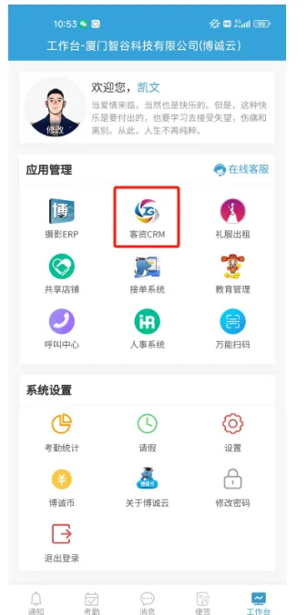 安装好了APP,我们只需登入我们APP界面(请注意,博诚云的账号如果是在同个APP里面的应用是一账号通用的),在首页微应用中,我们点击智谷客资