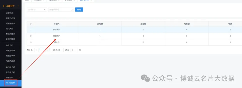 当我们在客资输入的时候填入了转介绍人的同时,那么在系统的后台统计数据中就会有数据统计,该介绍人给我们提供了多少客资!进入CRM系统,点击:战略分析-转介绍分析表(如下图)