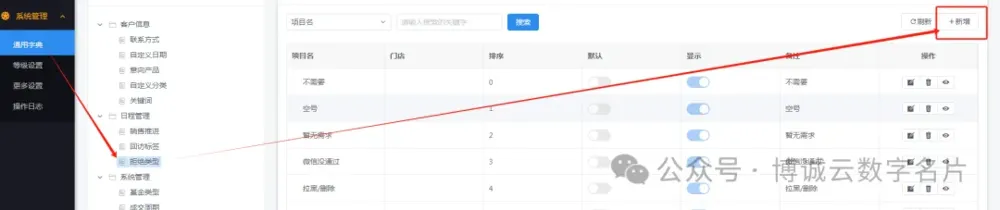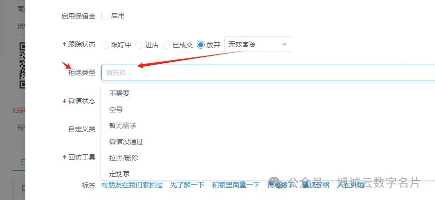 日常我们在跟踪客资时,当某个客资无效了,那么我们就放弃该客资,并填好客户拒绝的原因,那么如果需要再系统上新增一个拒绝类型,请按下图步骤进行新增!
