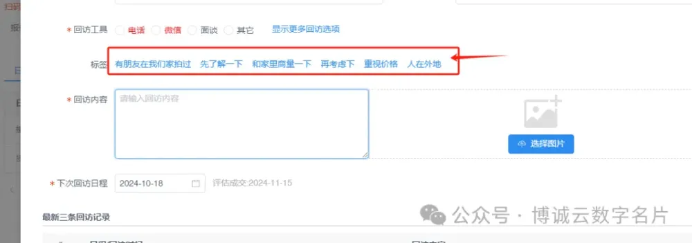 日常邀约人在邀约客户的时候,需要填上本次回访的内容,那么如何可以快速的填入一些日常常用的一些内容呢,这时候系统的回访标签就可以快速的帮助您嘞!