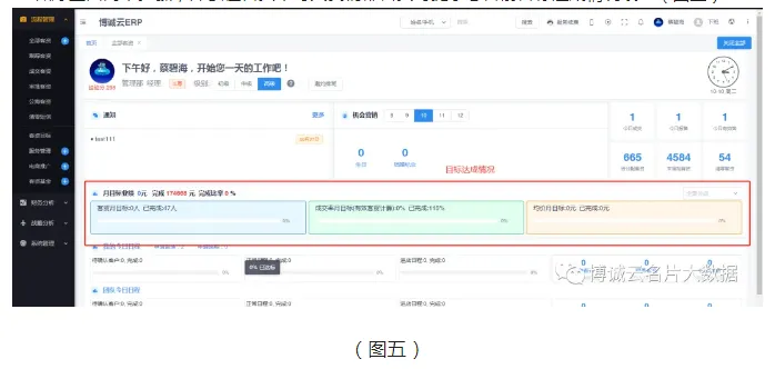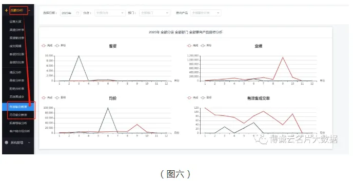 同时您在战略数据分析中的年目标分析与月目标分析的图表中,您也可以清晰的了解每个月的目前达成情况统计(图六)
