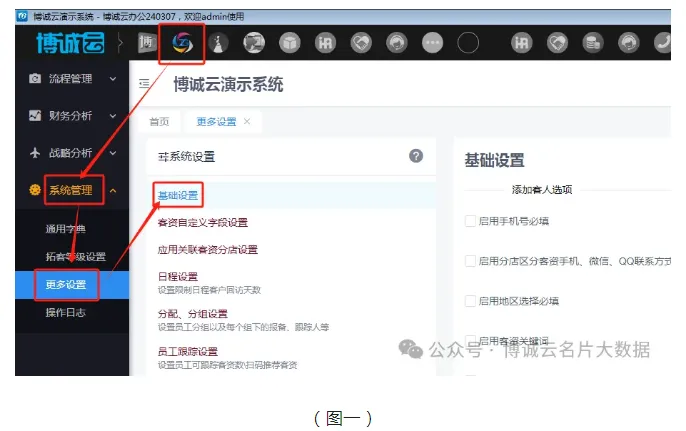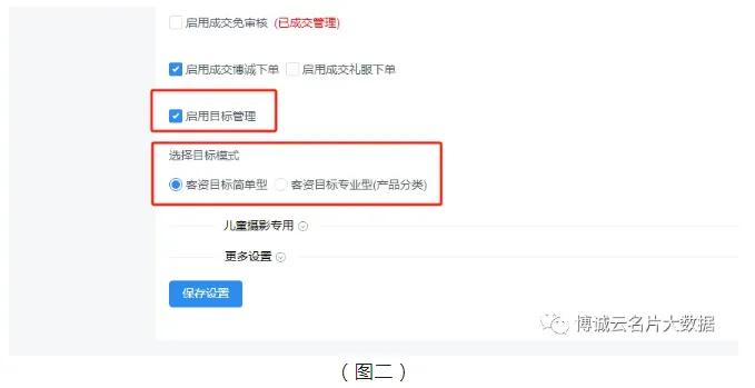 首先在客资软件中的系统管理里面点击更多设置 中的基础设置(图一),在这里面下方找到(图二)选择开启目标管理与选择目标模式