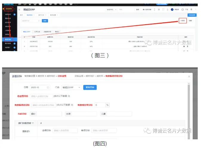 开启了目标管理功能后,那么我们需要到目标设置里面去设置好当月或者次月的客资目标情况!(如 图三、图四)