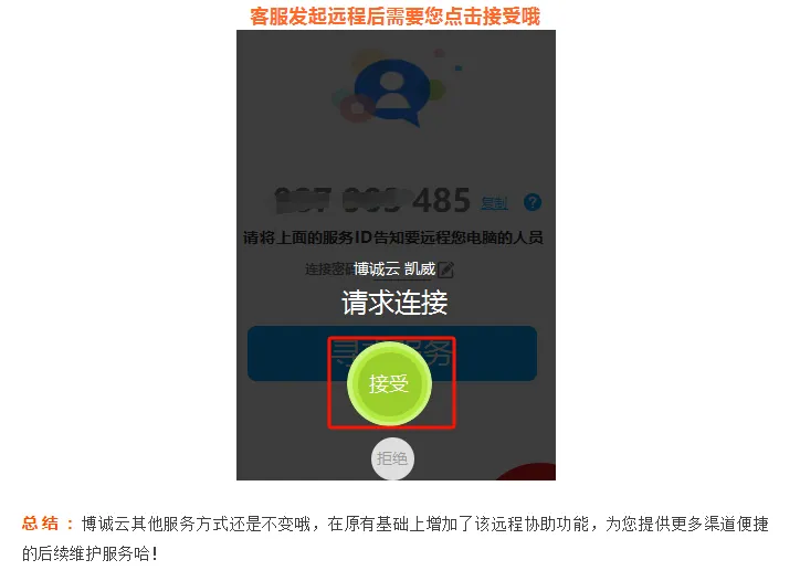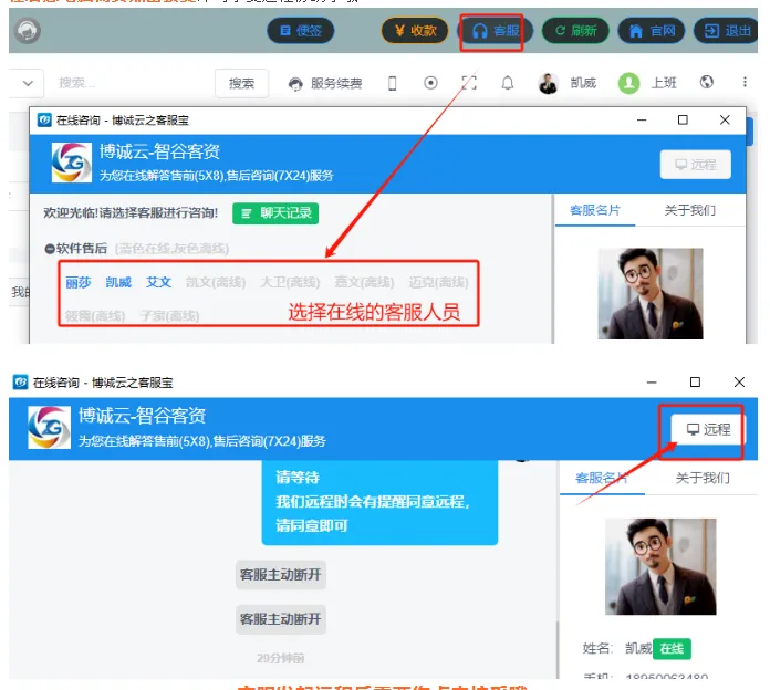 因在博诚云办公登入后,软件右上角有【客服】按钮,您点击【客服】按钮,选择了某个客服后即可会话,会话过程中需要远程的可以直接点击左上角【远程】按钮,即可提醒我们客服为您远程,客服远程后您电脑需要点击接受即可享受远程协助了哦。