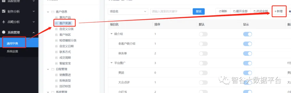 这个问题答案在:系统管理-通用字典-客户来源-新增(右上方)