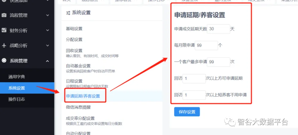 而延期的设置:系统管理-系统设置-申请延期/养客设置(设置延期养客的条件)