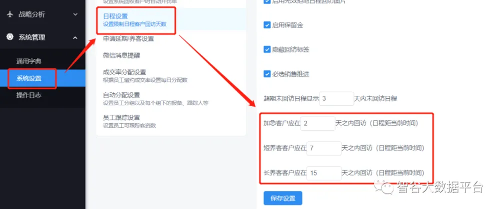 而养客的设置:系统管理-系统设置-日程设置-设置天数