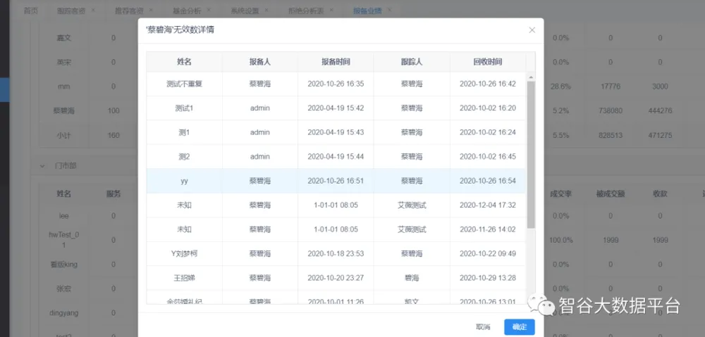 3.报备业绩新增点击'无效数'列弹出框显示无效数详情列表