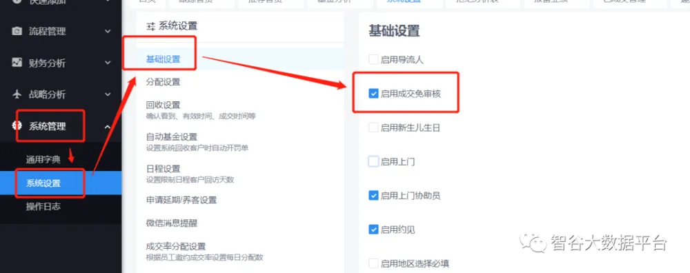 经多次与用户沟通,考虑到用户实际的体验感与工作中实际的情况,于是我司研究决定设置一个新权限,让我们的成交客资可以“免审核”,直接统计成交数据!那么我们只要做的是点击软件的“系统管理”-“系统设置”-“基础设置”-“启用成交免审核” 然后保存,这样,日后成交的客资您就可以免去审核的动作啦!怎么样,您学会了吗?